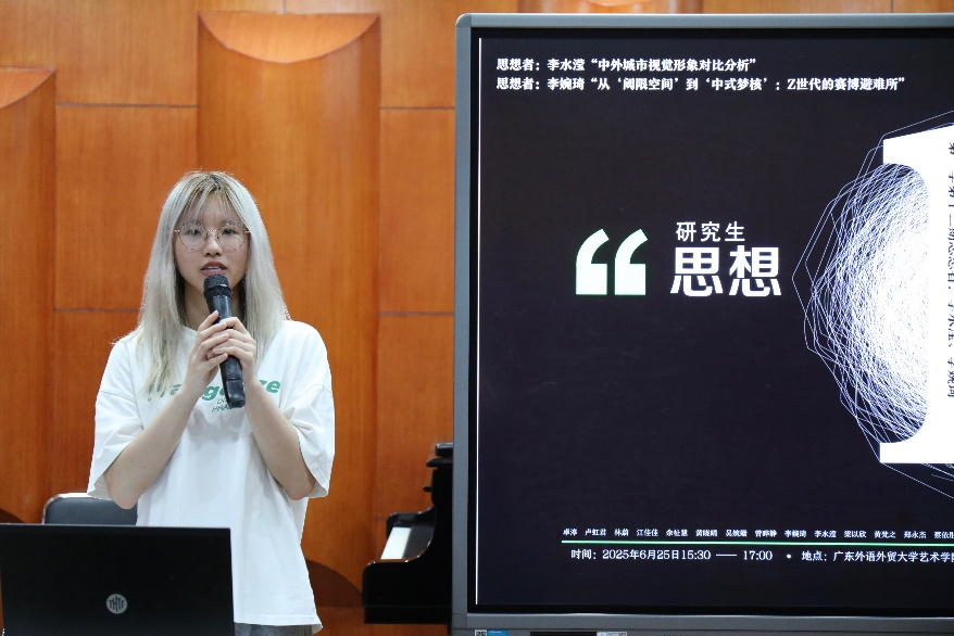李婉琦讲述的题目是“从‘阈限空间’到‘中式梦核’:Z世代的赛博避难所”,她首先播放了一个视频,进而引出了梦核相关概念的介绍。明确了“阈限空间”是核艺术创作的基础,基于“阈限空间”的梦核艺术在中国互联网流行之后流变为“中式梦核”,受到Z世代群体的欢迎。她提到,“中式梦核”根植于Z世代早年的生命经历,通过经由技术模拟手段做旧的低保真图像还原了Z世代的童年记忆印象。在这个高速变化的时代,Z世代年轻人面临着诸多压力和不确定性。网络梦核艺术为他们提供了一个逃离现实、寻找心灵慰藉的空间。同时,她还对比分析了中西方梦核艺术的差异及其社会文化原因,在视觉表达差异的背后,是两方现代化进程、媒介生态与美学传统的历史性发展差异,这些差异不仅体现了各自的文化价值观,也为视觉传达设计的跨文化表达提供了新的启示。