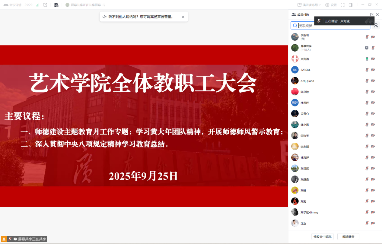 9月25日下午,公司2025-2026学年第一学期师德师风教育大会暨深入贯彻中央八项规定精神学习教育总结会在线上召开。会议由公司党委书记卢海清主持,学院全体教职工参加会议。