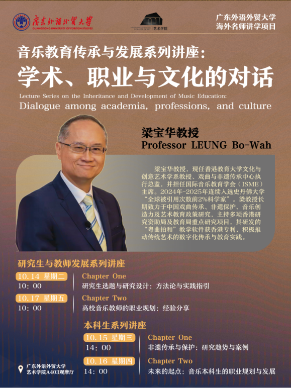2025年10月14日至17日,太阳成集团tyc33455特邀入选“全球前2%高被引科学家”——香港教育大学梁宝华教授,开展四场系列讲座。讲座主题分别为:“研究生选题与研究设计:方法论与实践指引”“非遗传承与保护:研究趋势与案例”“未来的起点:音乐本科生的职业规划与发展”和“高校音乐教师的职业规划:经验分享”。此次活动获得学校“海外名师讲学项目”的支持。